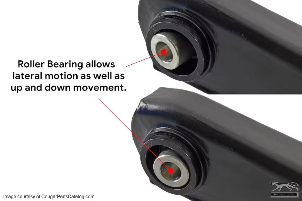 These control arms are a slightly modified version of the 68-73 lower control arms found on Cougar and Mustang. A roller bearing has been added at the mounting point allowing them to move up and down, laterally and also allows for a small amount of twisting. This creates smoother handling.